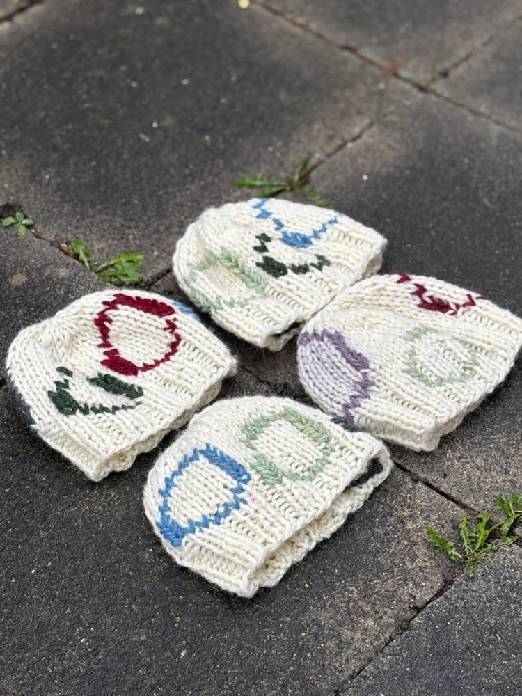 CIRKUS huen er designet med inspiration fra farver og former i cirkus i Danmark. Der er anvendt 2 tråde Dansk Østersøuld, og der er broderet med dobbelt tråd kraftigt garn. Huen strikkes rundt fra nederste rib til toppen af huen. Der broderes derefter på huen med restegarn