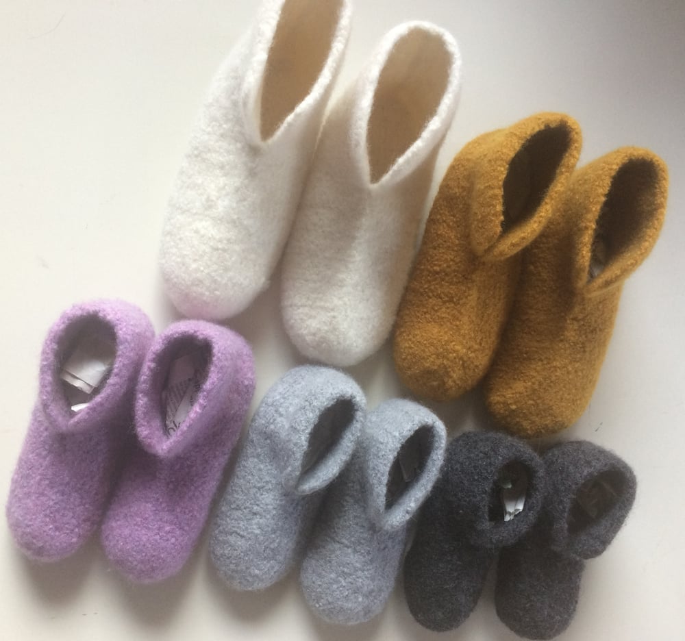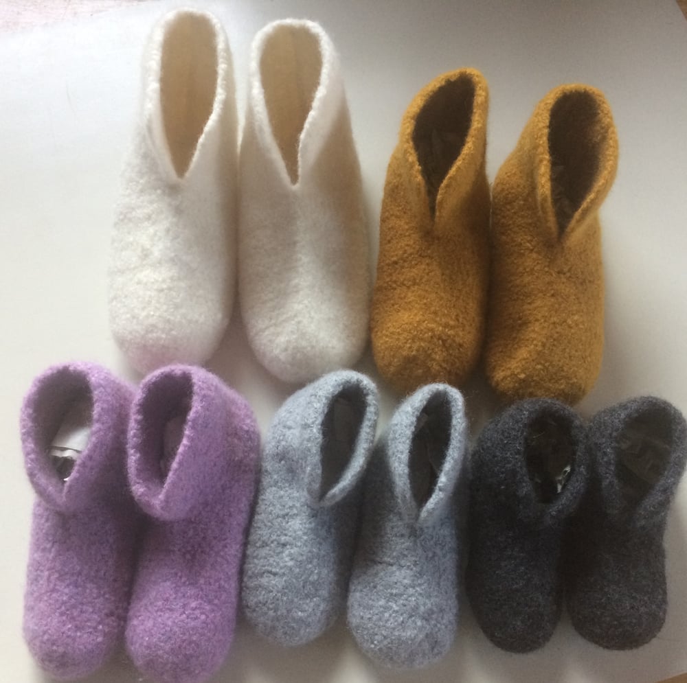 Hjemmeskoene hækles i 100% uld, som ikke kradser, når skoen er filtet.